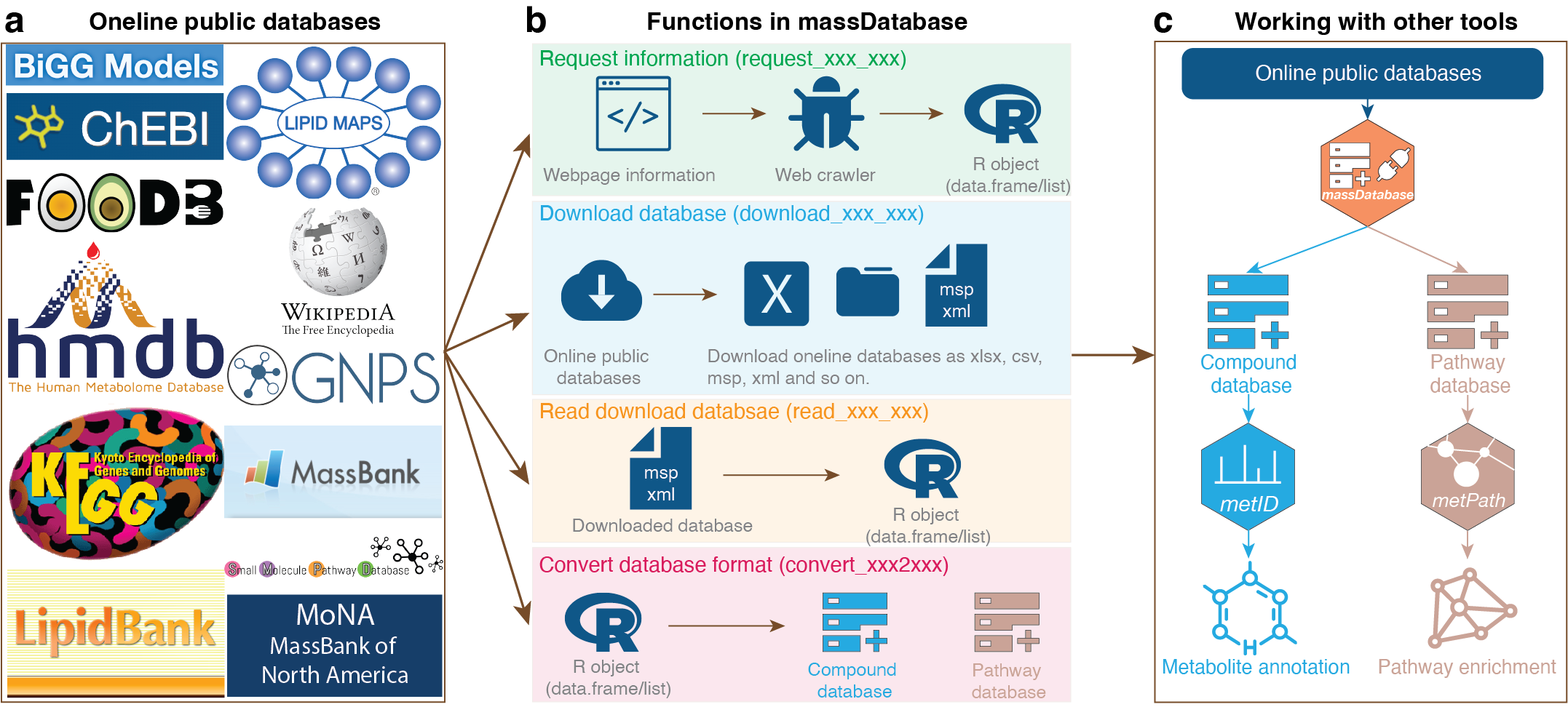 massdatabase is an R package that operates the online public databases and combines with other tools for streamlined compound annotation and pathway enrichment analysis. massDatabase is a flexible, simple, and powerful tool that can be installed on all platforms, allowing the users to leverage all the online public databases for biological function mining.