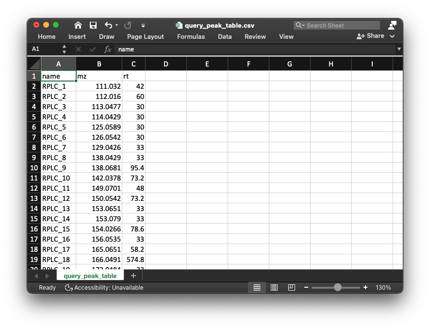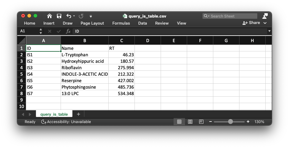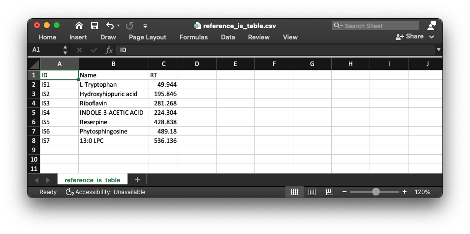 This is the table of retention time of reference internal standards (csv or xlsx format). It looks like below figure shows: