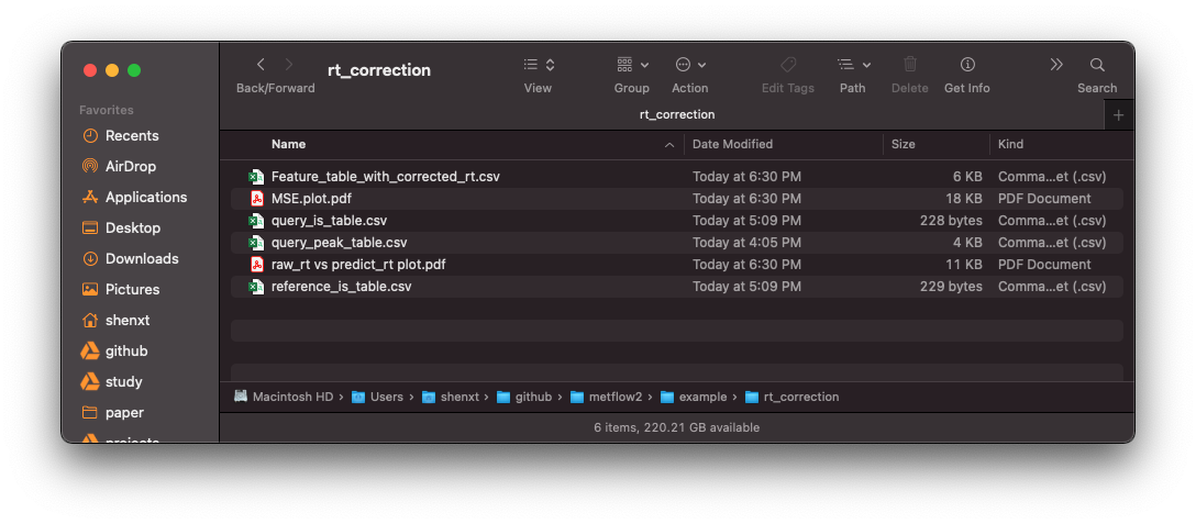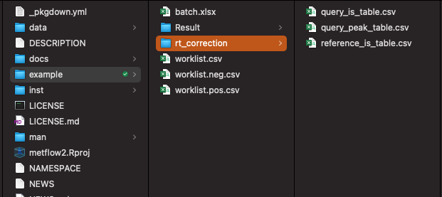 here I download the demo data into a folder named as “example”, and then uncompress it, so the data now at the directory: ./example/rt_correction.
